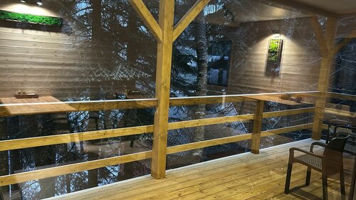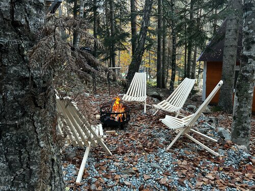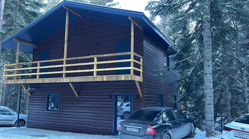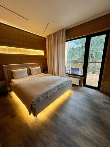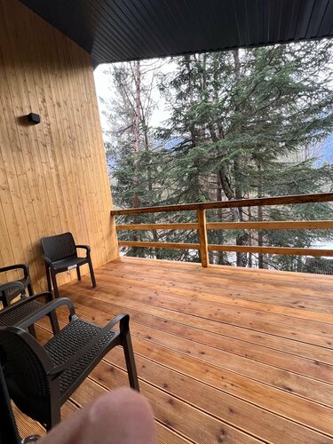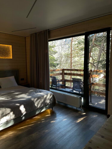 Шикарное место для отдыха душой. Отель расположен в живописном хвойном лесу. Номер чистый, аккуратный с новой мебелью. Есть балкон с видом на лес, с моего балкона была видна гора с заснеженным пиком. В номере также есть холодильник, чайник, посуда. Санузел чистый, пахнет приятно, играет музыка ). На территории есть мангальная зона и зона с костровой чашей. Гамак и качели для маленьких посетителей. В наличии общая отдельная кухня и столовая , где можно приготовить или разогреть еду. Персонал вежливый. Мне очень понравилось, рекомендую 👍