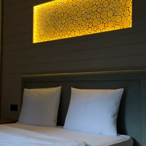 В номерах первозданная чистота!!!Мягкая, удобная постель с красивой светоинстолляцией😍😍😍!!Отдельный девичий рай : это ванная комната с зеркалом с подсветкой и мягкими,нежными полотенцами!!Где, одно удовольствие ухаживать за собой и преображаться !!🫶🫶🫶