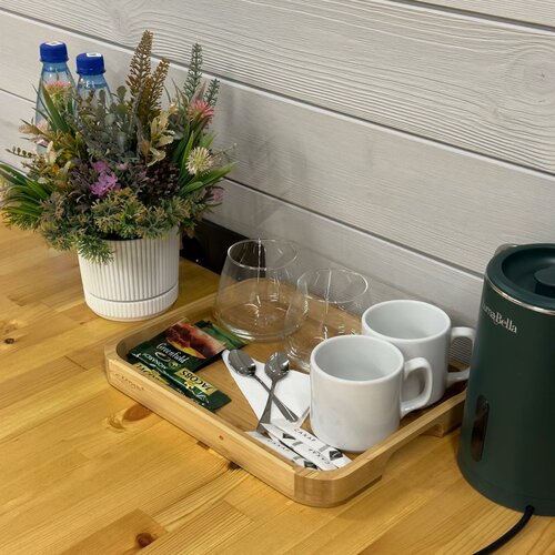 В номере очень чисто, приятный запах дерева. Есть все необходимое, чайник , чай, кофе, сахар, вода .